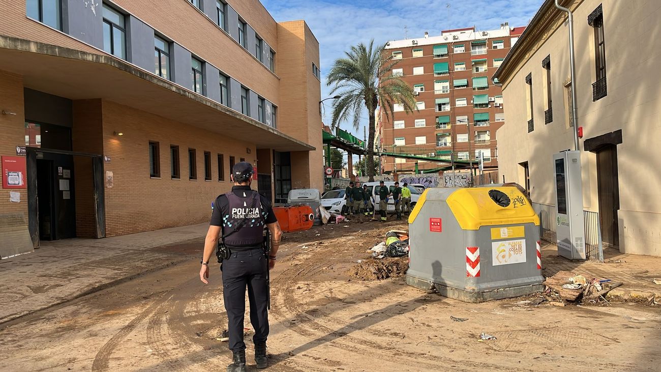 Agentes de la Policía Local de Fuenlabrada están colaborando en la liberación del centro de salud de la localidad valenciana de Alfafar, muy afectada por la DANA, facilitando así su limpieza para que pueda volver a estar operativo lo antes posible.