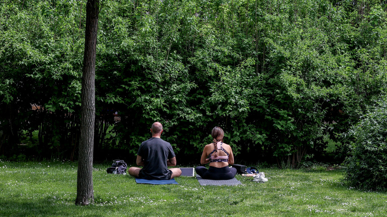 Dos personas hacen yoga en un parque |EUROPA PRESS