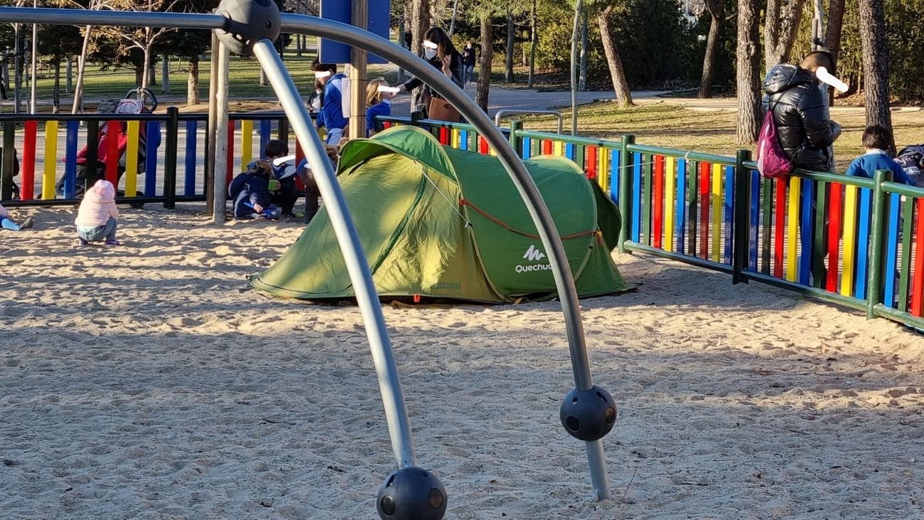 Una persona que vive en la calle ha acampado en el interior de un parque infantil del distrito Fuencarral-El Pardo, ubicado frente a un colegio y un centro municipal deportivo, ante la indignación de los padres al no poder echarle la Policía Municipal de Madrid.