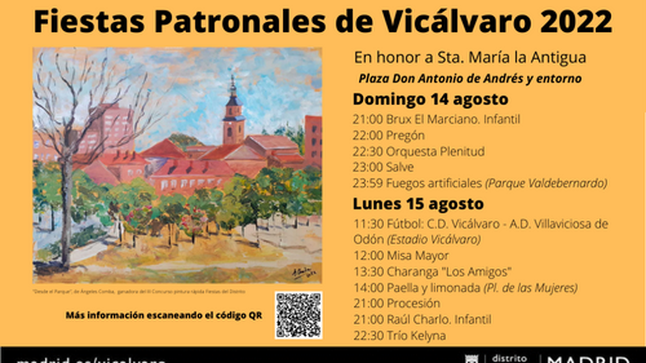 Vicálvaro celebrará este domingo 14 y lunes 15 de agosto las fiestas patronales de la Virgen de la Antigua. Este año, se volverán a llenar de lugareños las plazas de Don Antonio de Andrés y de las Mujeres, donde se llevarán a cabo diferentes tipos de actividades como espectáculos y veladas musicales, fuegos artificiales, así como una comida popular gratuita a base de paella y limonada.