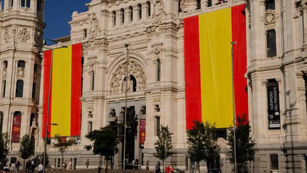 DOS GIGANTES BANDERAS DE ESPAÑA CUBREN YA LA FACHADA DEL AYUNTAMIENTO