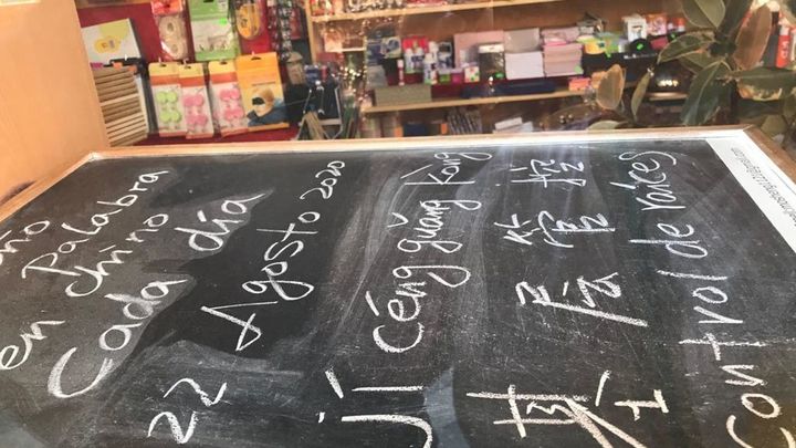 Una pizarra colgada junto a la entrada con un mensaje sencillo: “enseño una palabra de chino cada día”. La fecha, unos caracteres ilegibles para la mayoría, la pronunciación para los que desconocen la lengua de Confucio y su traducción a la lengua de Valle Inclán y así explicando a los transeúntes cómo se debía escribir y leer “diccionario chino” empezó una tradición que dura ya más de una década.