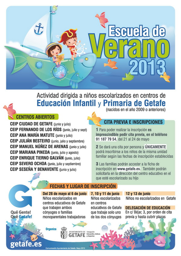‘Escuelas de Verano’ es un programa de la delegación de Educación del Ayuntamiento de Getafe, en colaboración con los centros públicos, que tiene como objetivo ayudar a las familias a conciliar la vida familiar con la laboral y ofrecer a los niños una alternativa diferente y divertida de disfrutar sus vacaciones estivales.
