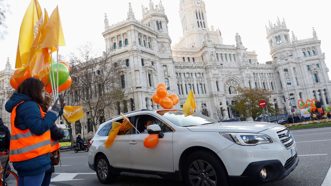 Coches con pasquines amarillos y naranjas con el lema "Stop ley Celaá" recorren este domingo el centro de Madrid para protestar contra la reforma educativa aprobada en el Congreso, al considerar que "ataca" la libertad de los padres para escoger la enseñanza que quieren para sus hijos.