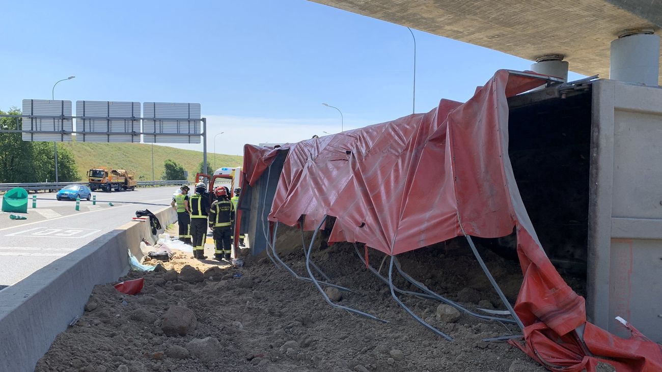 Un camión con 20.000 kilos de arena volcó este viernes en el acceso de la M-31 desde la M-40, que quedó cortado al tráfico al quedar la carga esparcida por la calzada, han indicado fuentes de Emergencias Madrid.