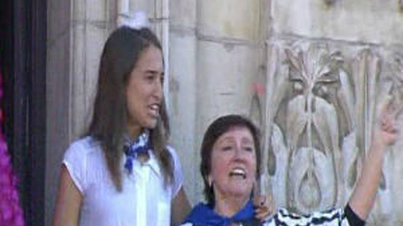Artola no ha podido ejercer de "txupinera" en el balcón del teatro por la prohibición judicial y en su lugar, ha prendido el cohete la concejala de Fiestas, Itziar Urtasun.