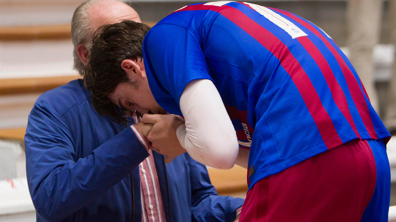 En ese mismo momento, Pablo Urdangarín se estaba sacando 'selfies' con varios niños que se le acercaban y, acto seguido, ha acudido al punto donde estaba su abuelo para abrazarlo durante unos segundos. Ambos se han intercambiado algunas frases al oído e, incluso, el jugador del Barça B le ha besado la mano.