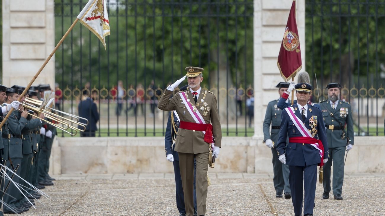 El acto ha comenzado con el recibimiento con honores a Felipe VI, quien ha vestido uniforme de capitán general del Ejército de Tierra y el collar de soberano.