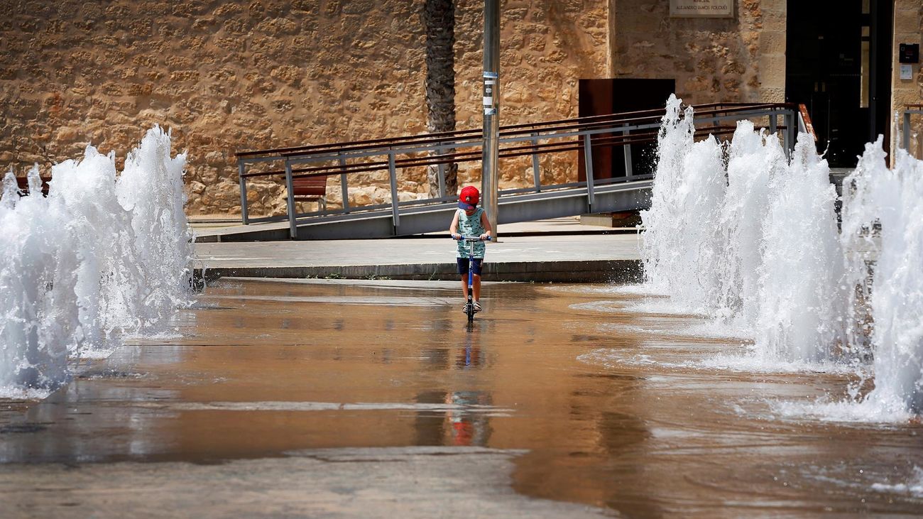 Un niño busca la mejor zona de juego en Alicante, rodeado por chorros de agua. Allí las temperaturas serán algo más benévolas, aunque 33 grados en la costa ya es mucho calor... |EFE