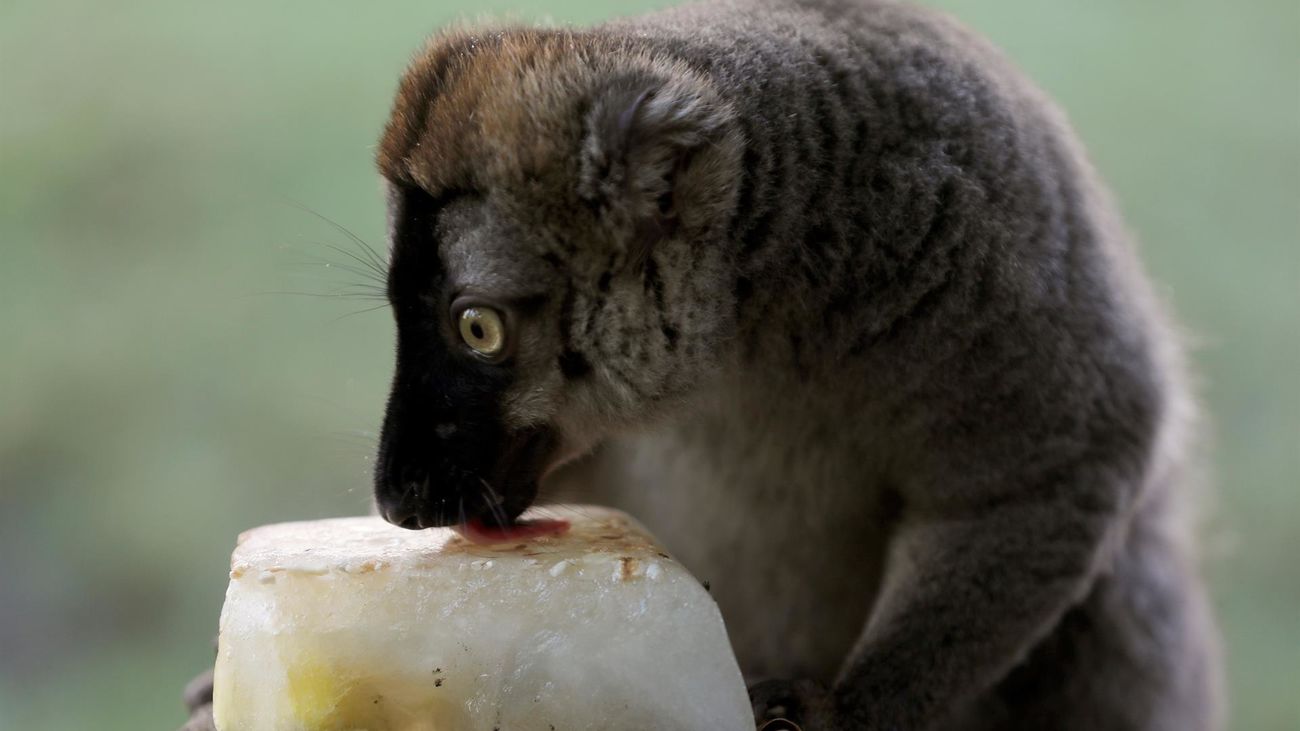Los animales de los parques zoológicos también pasan mucho calor. Por eso, durante estos días les ofrecen alimentos frescos e hidratantes. Este lemur catta disfruta en Bioparc de Valencia de un helado. |EFE