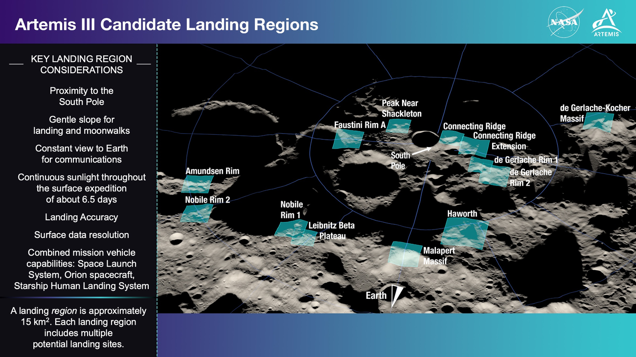 Con el objetivo de seleccionar estas regiones, un equipo de científicos e ingenieros de la agencia evaluó la zona cercana al polo sur de la Luna utilizando datos del Orbitador de Reconocimiento Lunar de la NASA, así como décadas de publicaciones y hallazgos científicos lunares.