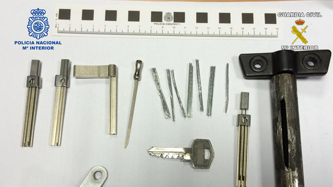 Además de las detenciones se realizaron registros en los domicilios de los detenidos, donde los agentes se incautaron de multitud de efectos, presumiblemente sustraídos, y todo tipo de instrumentos utilizados para cometer los robos, como plásticos para el procedimiento del resbalón, martillos empleados para fracturar cerraduras por el método del bumping y todos los elementos usados en la modalidad del impresionin".