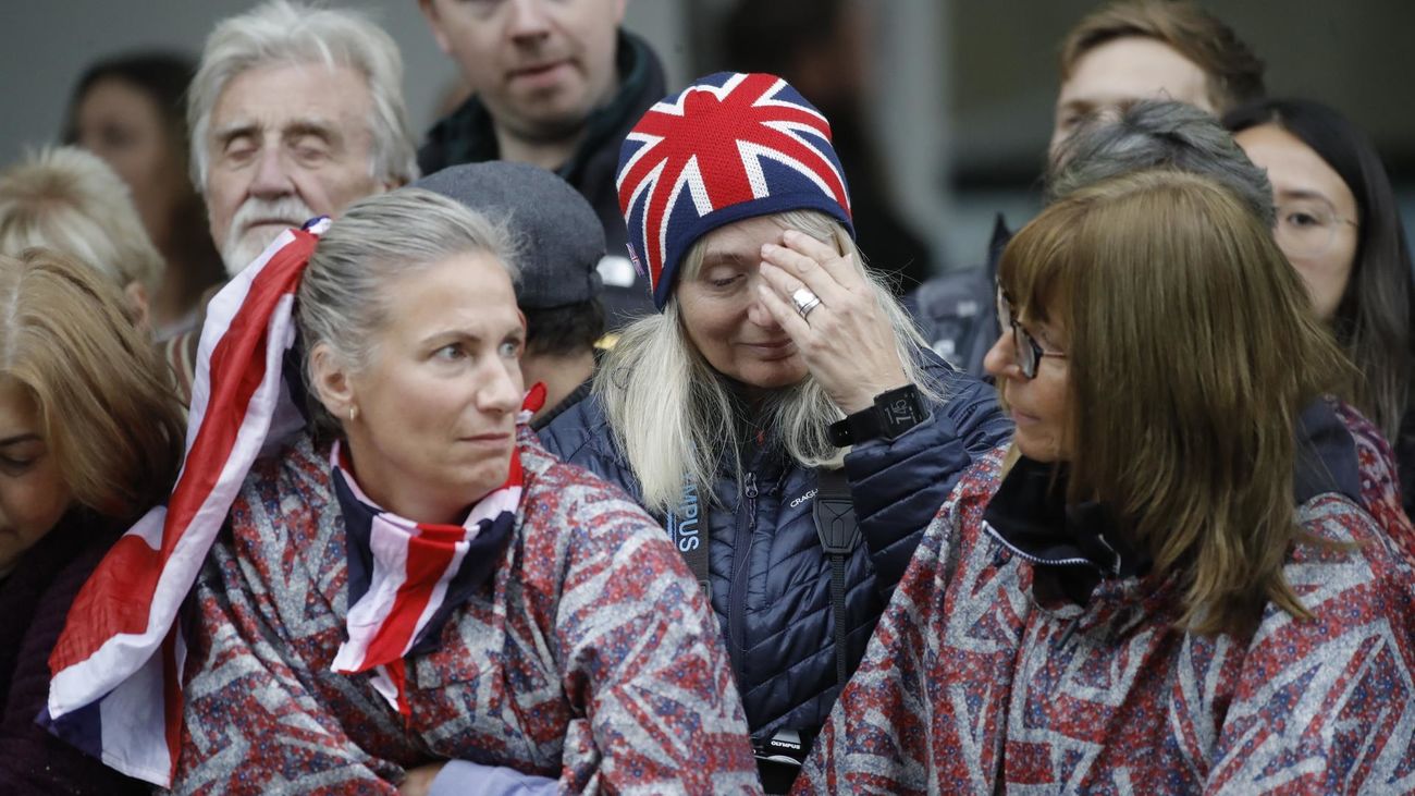 Ataviadas con la bandera británica, muchas personas esperan desde hace horas y horas el paso del féretro de Isabel II, a lo largo del recorridos hasta la abadía de abadía de Westminster