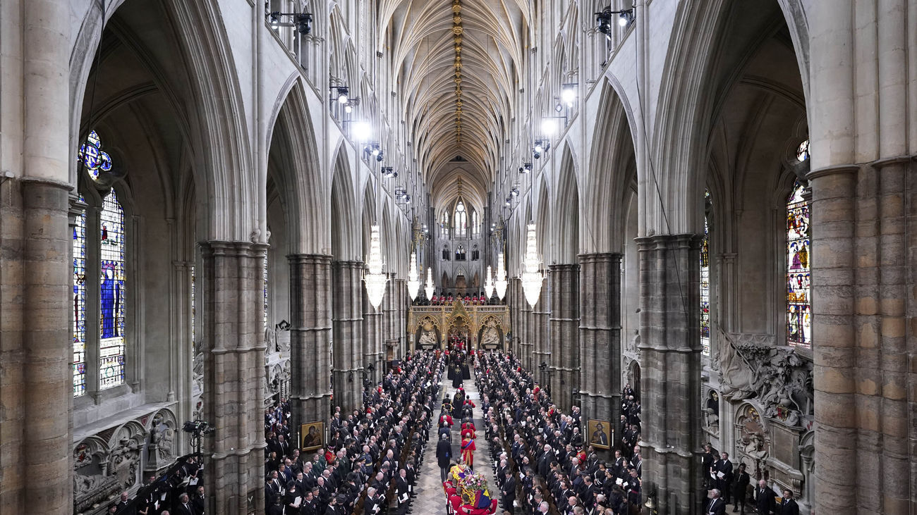 El féretro de Isabel II recorre es pasillo principal de la abadía de Westminster.