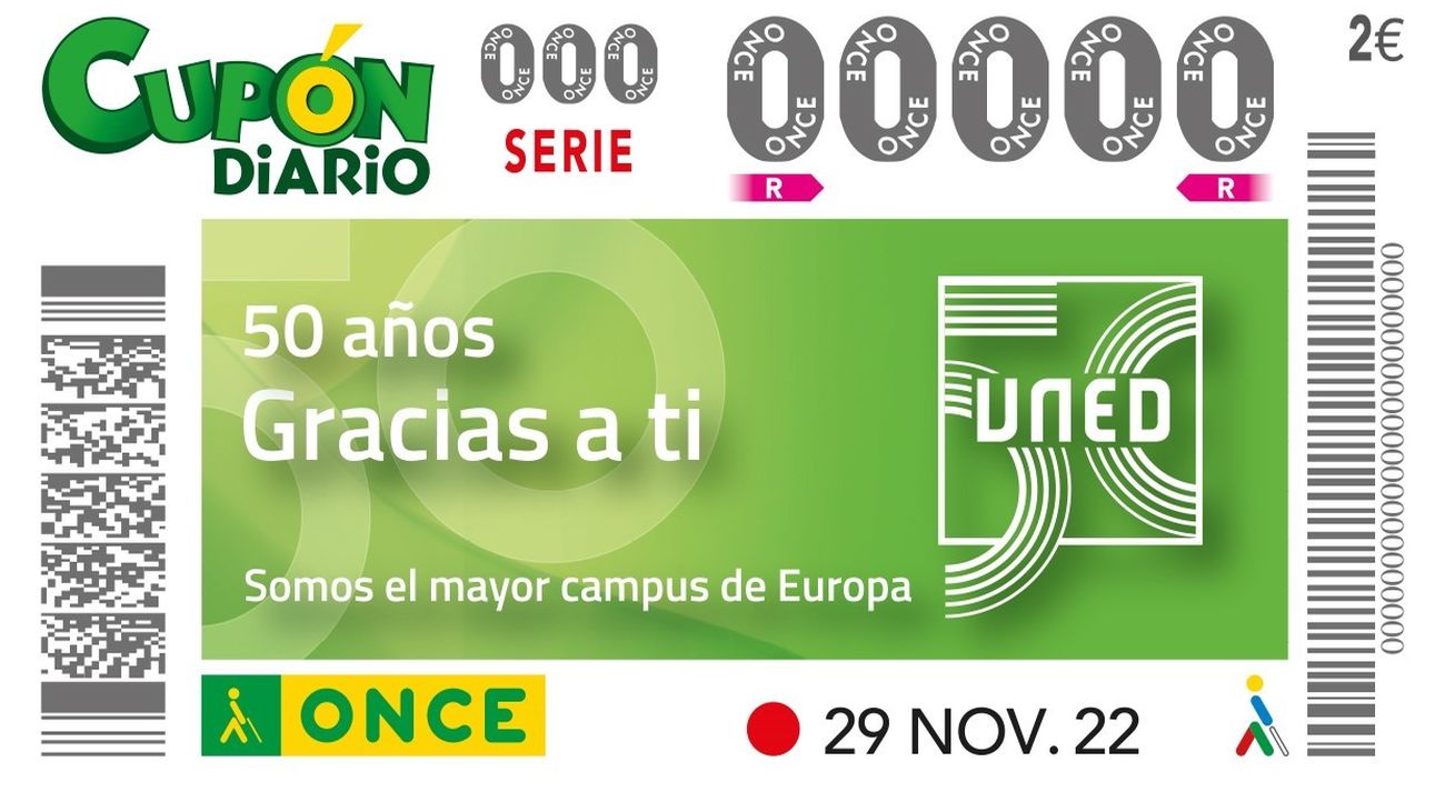El 50 aniversario de la UNED es el motivo del cupón de la ONCE del martes 29 de noviembre. Serán cinco millones de cupones los que se distribuirán por toda España bajo el lema ‘Gracias a ti somos el mayor campus de Europa’La UNED es la universidad pública más grande de España tanto en número de estudiantes como en oferta académica, explican en una nota.
