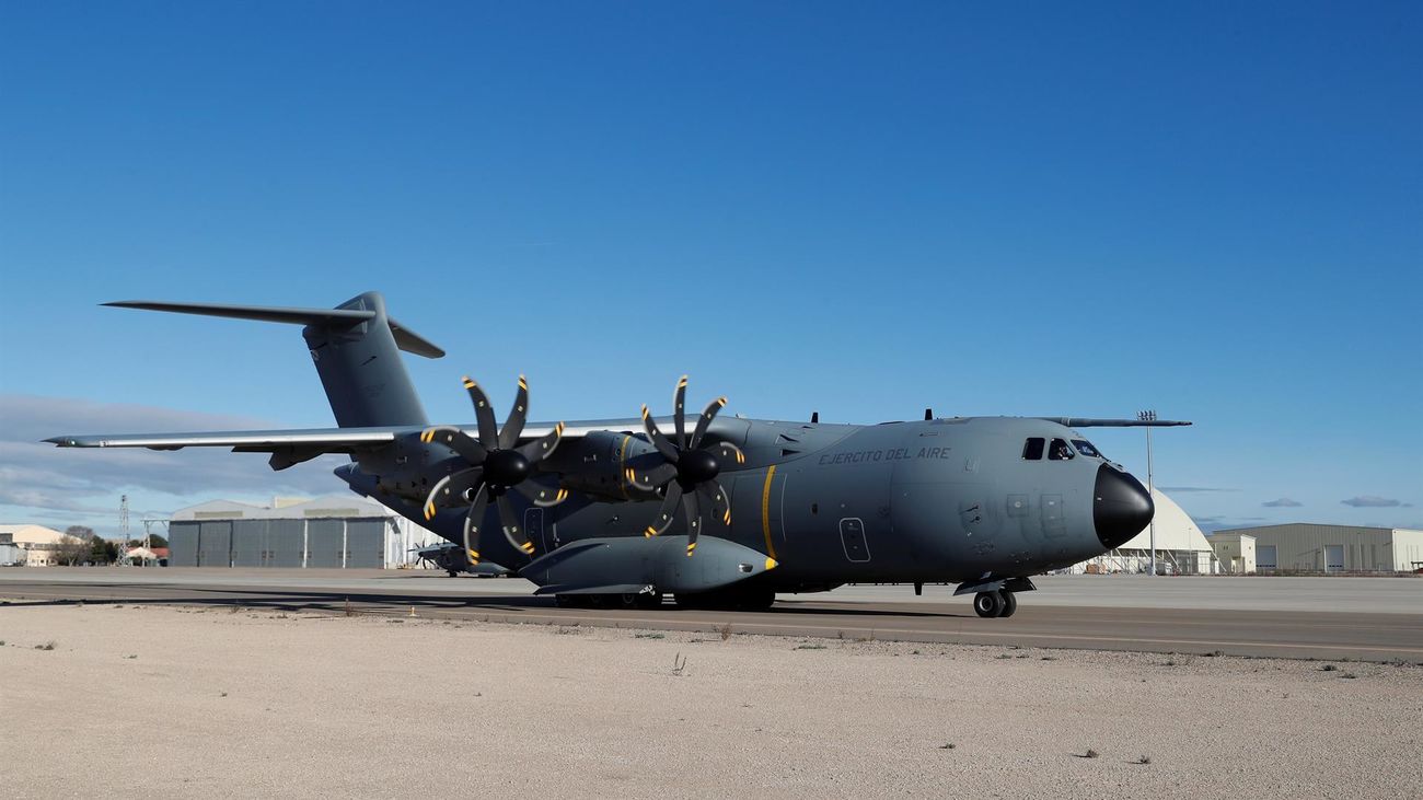 El avión A-400 del Ejército del Aire antes de despegar este domingo de la base militar de Zaragoza |EFE