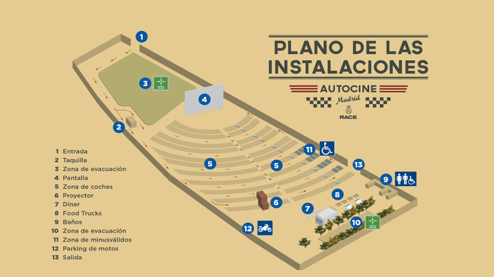 Autocine Madrid Race se encuentra en el distrito de Fuencarral-El Pardo, en la calle Isla de Java 2. Cuenta con más de 27.000 metros cuadrados de espacios exteriores.