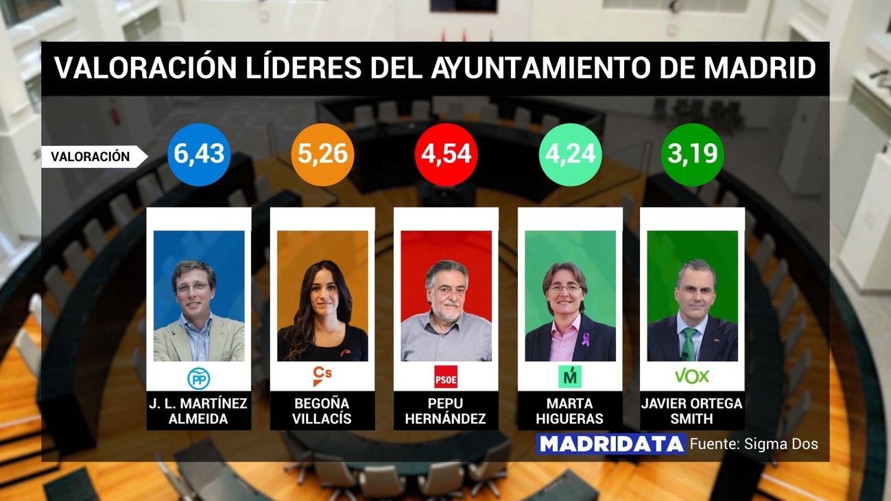 Por debajo del 5 y, por tanto, en el suspenso, se encuentran el resto de líderes políticos en el Ayuntamiento de Madrid. El socialista José Vicente 'Pepu' Hernández tiene una nota de 4,54, mientras que la representante de Más Madrid, Marta Higueras, obtiene un 4,24 de calificación. Javier Ortega Smith (Vox) se queda con un 3,19, siendo así el peor valorado.