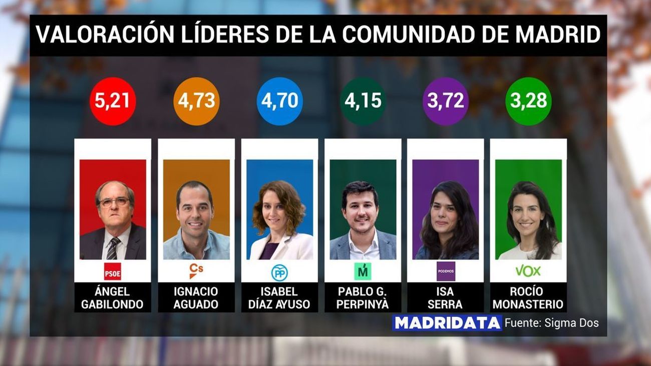 La encuesta MadriData elaborada por Sigma Dos para Telemadrid a partir de 1.600 entrevistas, realizadas entre el 19 y el 22 de junio, refleja que la actual presidenta de la Comunidad de Madrid y líder del PP en el Parlamento regional, Isabel Díaz Ayuso, suspende en valoración para los madrileños, con una nota de 4,70, por debajo ligeramente de su socio de Gobierno, Ignacio Aguado (Ciudadanos), que obtiene un 4,73.