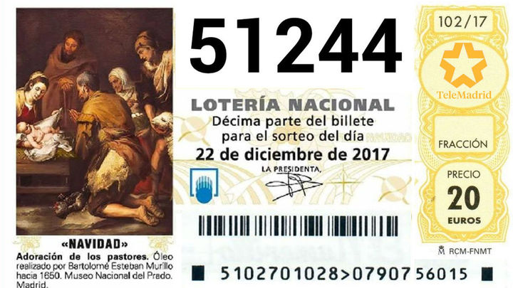 El número 51.244 ha resultado agraciado con el segundo premio del Sorteo Extraordinario de Lotería de Navidad, dotado con 1.250.000 euros a la serie y se ha vendido en Madrid. En concreto, se ha vendido en la administración de Doña Manolita, en calle Carmen, 22; en la ubicada en el intercambiador de Plaza Elíptica (Plaza de Fernández Ladreda); en Arganda del Rey, en la administración de la calle Real, 36; y en la de la calle Azuela, 29, en Collado Villalba.