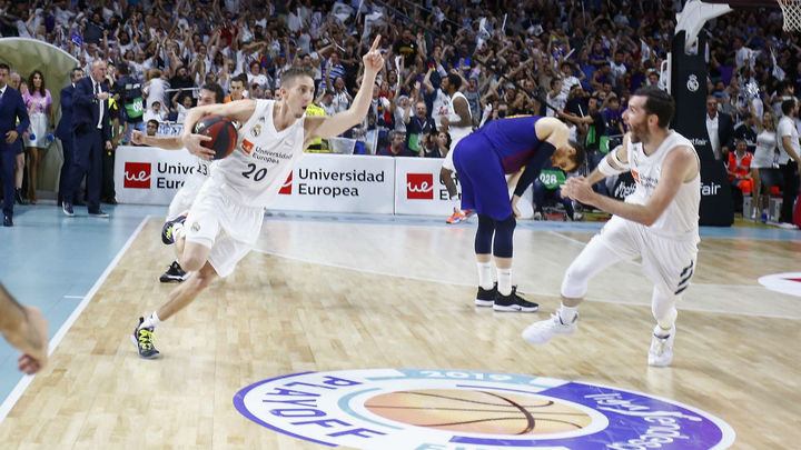 Jaycee Carroll se vistió de superhéroe para anotar su quinto triple en el último segundo y culminar una remontada imposible, 81-80, en un partido trabado, duro, jugado en las trincheras y que acerca al Real Madrid al título frente al Barcelona con un 2-0 en la final.