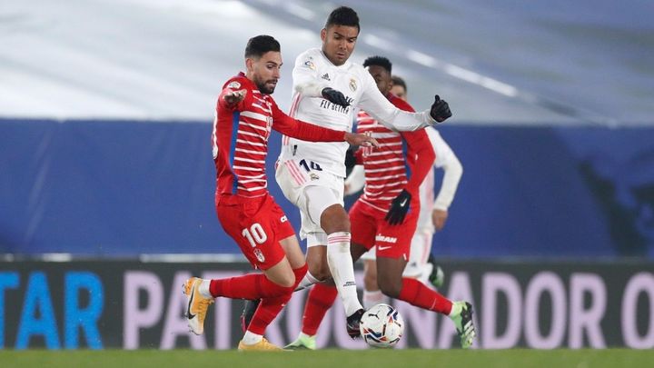El Real Madrid conquistó su quinta victoria consecutiva en la Liga Santander después de doblegar al Granada (2-0) gracias a los goles de Casemiro y Benzema, que permiten a los vigentes campeones mantener el cuerpo a cuerpo con el Atlético y consolidar su cambio de rumbo tras la derrota, ya lejana, ante el Deportivo Alavés.Zidane apenas mueve el once, solo por exigencias del guion, y está obteniendo el mejor de los resultados después de la marejada que vivió hace menos de un mes.