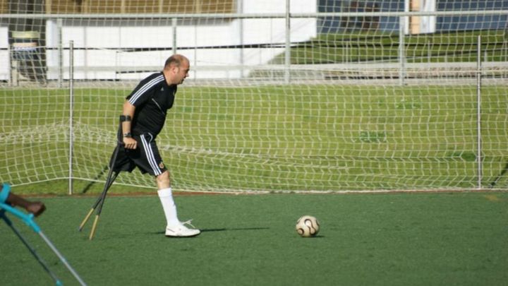 Eduardo Valcárcel es conocido en el fútbol madrileño y tiene una minusvalía y con una agilidad con las muletas consiguió marcar un gran gol.