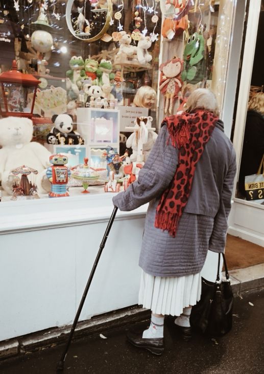 Una señora se para enfrente de un escaparate lleno de juguetes