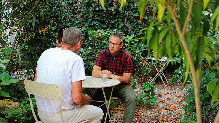 Julio y Ramón entran en la cafetería jardín del Museo del Romanticismo, un buen lugar para refugiarse del calor madrileño y charlar con tranquilidad.