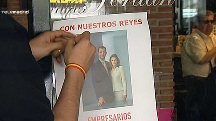 La Confederación Empresarial de Madrid (CEIM) y la Cámara de Comercio han iniciado la distribución de más de 50.000 fotografías, banderas y pegatinas de don Felipe y doña Letizia, para que sean expuestas en los escaparates de los comercios y en las fachadas de los edificios de la Comunidad de Madrid.