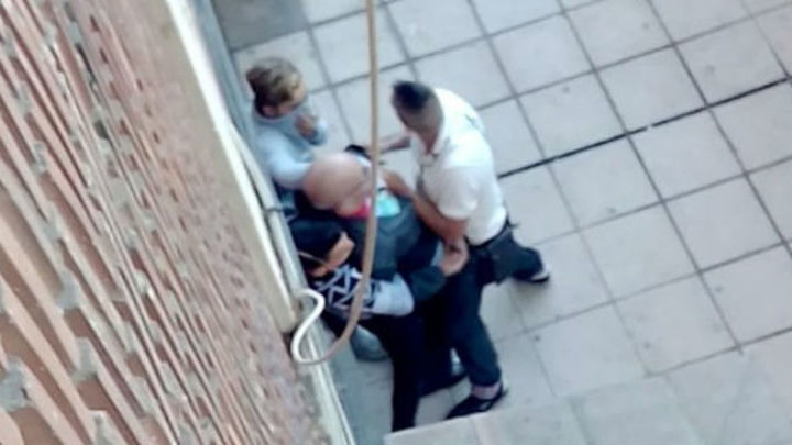 En esta secuencia grabada con el móvil de un vecino de la calle Rocafort y desde una ventana se aprecia perfectamente cómo tres individuos retienen a una persona mayor. Uno le agarra por el cuello, mientras los otros le registran y le roban la cartera y los enseres personales de interés. La víctima llama a gritos a la Policía y no puede hacer más para defenderse. Los delincuentes huyen después de haberle robado y con bastante tranquilidad.