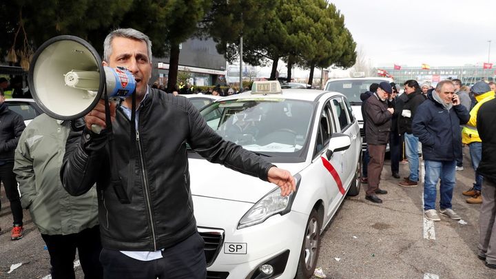 Los taxistas siguen en pie de guerra. En el tercer día de huelga se han manifestado a la salida de FITUR con el objetivo de que los profesionales del turismo de todo el mundo conozcan sus reivindicaciones. .