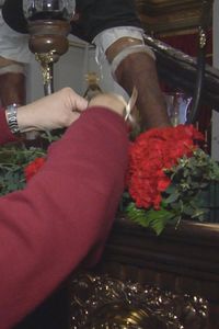 La técnica utilizada para colocar los claveles es crucial. "Sobre todo se intenta mantener una línea; ni demasiado apretado el clavel ni demasiado suelto. En el paso van unas cinco filas de claveles entre lo que sube y luego el remate de atrás", detalla Dani, otro voluntario encargado del arreglo.