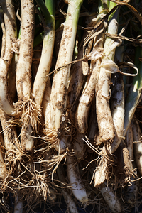 - Coger el calçot por el extremo superior con una mano (donde están las hojas) y la parte inferior con la otra.