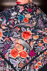 Los mantones de Manila son reconocidos por sus vibrantes colores, bordados intrincados y flecos llamativos. A pesar de su origen en China, estos mantones adquirieron su nombre por la capital filipina, un legado del antiguo Imperio Español. En cada pliegue se encuentra una historia que celebra la alegría y el colorido característicos de las festividades madrileñas.