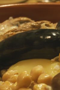 "No es el caldo oscurito que se toma aquí en Madrid", aclara Damián. Se cocina a fuego lento para evitar que el caldo se intensifique demasiado. Una vez que los garbanzos están casi listos, se añaden el repollo, la patata y la zanahoria.