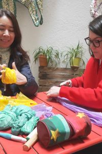 Los restos también tienen su lugar. "Con los que sobran al hacer los ovillos hacemos nuditos sobre mallas", señala Tania. Con estas piezas han creado instalaciones artísticas de gran formato. Una de ellas, en el Conde Duque, recreaba un paisaje completo con sol, laguna y montañas. El verano pasado dieron el salto internacional: realizaron un mural en Taiwán.