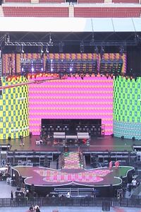 El escenario tiene dimensiones impresionantes: mide 50 metros de ancho por casi 50 metros de largo. Para hacer posible este espectáculo, se utilizan casi 800 focos y más de mil metros cuadrados de pantallas entre cielo y suelo. En términos sonoros, se cuentan con 175 cajas que suman casi medio millón de vatios. "Se necesita mucho y aparte se quiere dar mucho al show", concluye Peter.