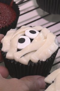 - Cubrir el cupcake con crema de queso teñida de negro, añadirle dos ojos de caramelo y hacer líneas de nuevo con crema de queso, esta vez sin teñir, para transformar nuestro dulce en una momia.
