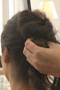 - Recogido glamuroso. "Tiene un truco muy divertido, que es que se puede coger con un peine que tenga palo o con el palo de un chino sencillamente. Entonces, cuando haces ese giro, el mismo palo te va a sujetar el cabello. O sea, tú estás con tus brazos en alto, hacer el giro y él mismo lo va ensortijando. Una vez que se ha creado la forma del moño divertida, lo aseguramos con horquillas y después sacas el palo o el peine".