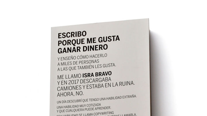Isra, al contrario de lo que podamos pensar, no tiene ningún estudio oficial aunque si le ha dedicado muchas horas a empaparse de todos los conocimientos relativos a los anuncios y sus técnicas. Ha tenido más de 30 trabajos, alguno como comercial y el último, antes de dedicarse a la escritura persuasiva, fue de descargador de camiones.
