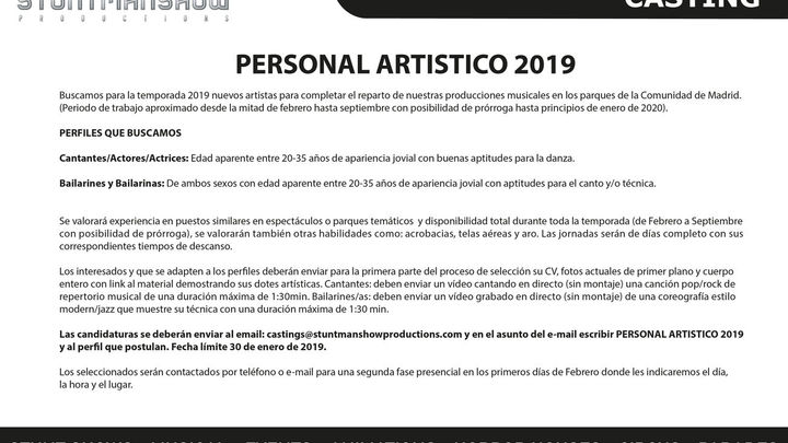 Los interesados pueden mandar su candidatura a la siguiente dirección de correo: castings@stuntmanshowproductions.com. El plazo está abierto hasta el 30 de enero de 2019 y en el asunto del correo electrónico debe figurar ‘Personal artístico 2019’, seguido del puesto al que postulan.