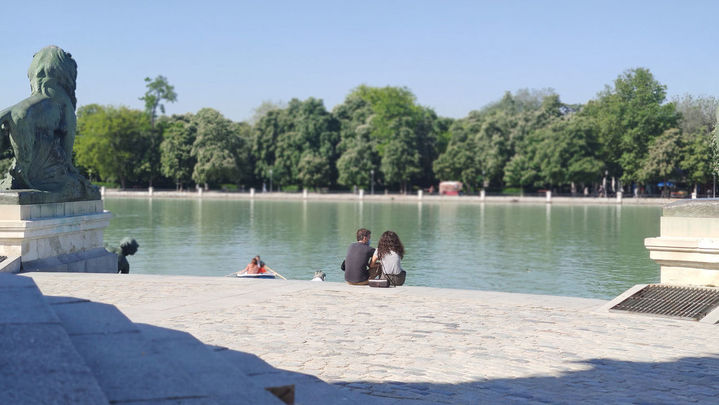 Una pareja observa el estanque del Retiro en las escaleras del monumento de Alfonso XII |Estefanía Esteban