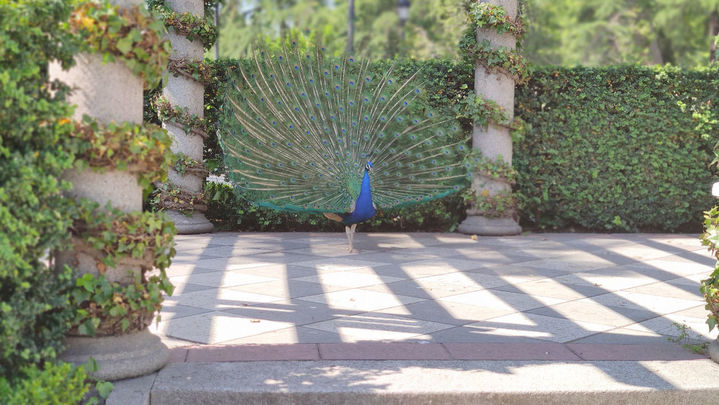 Pavo real tras los escalones de uno de los laterales del jardín de Cecilio Rodríguez, El Retiro |Estefanía Esteban