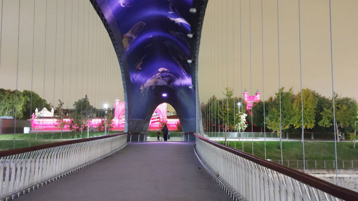 La pasarela del Matadero, iluminada por la noche |E.E