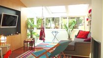 Pero para el visitante que llega a su casa, lo que más llama la atención no es la terraza repleta de plantas, ni la chimenea rústica, ni el cuarto de baño oculto tras el 'cubo de almacenaje', sino una pequeña bañera-piscina que tiene en medio del salón, junto a la terraza y con acceso directo al misterioso baño blanco de techo amarillo.