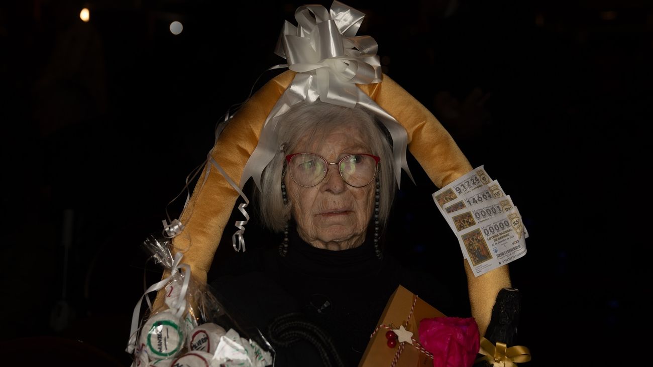 Manoli, vestida de cesta de Navidad antes del comienzo del Sorteo Extraordinario de la Lotería de Navidad 2023 |EUROPA PRESS